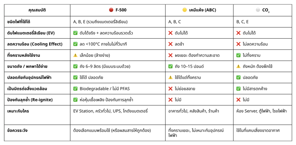 การเลือกถังดับเพลิงให้เหมาะสมกับประเภทของไฟและลักษณะสถานที่คือสิ่งสำคัญ ด้านล่างคือการเปรียบเทียบจุดเด่น–จุดด้อยของถังดับเพลิงแต่ละชนิด เพื่อช่วยให้คุณตัดสินใจได้แม่นยำยิ่งขึ้น